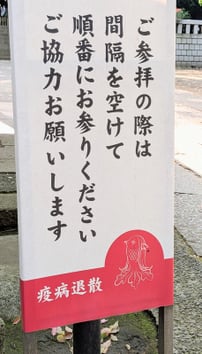 手水舎横には、コロナ禍で登場したソーシャルディスタンスを促す立て看板。 コロナが落ち着いた今でも、様々な疫病神が世の中に溢れているから、このままでもいいのかな・・・。 アマビエさん、お願いします!